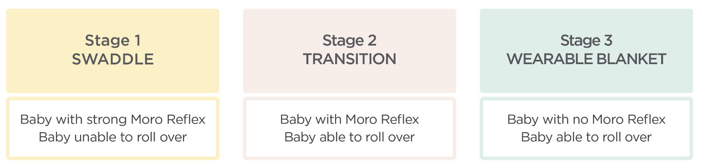 Lynette Damir, RN, identified and named “The Transition Stage” – the time period when caregivers need to stop swaddling their baby because their baby starts to show signs of rolling over and prior to the time when baby is able to sleep well in a wearable blanket. During the Transition Stage, babies still experience a strong Moro (startle) reflex and they are able to roll over from back to tummy. The Transition Stage can last for many weeks or months.