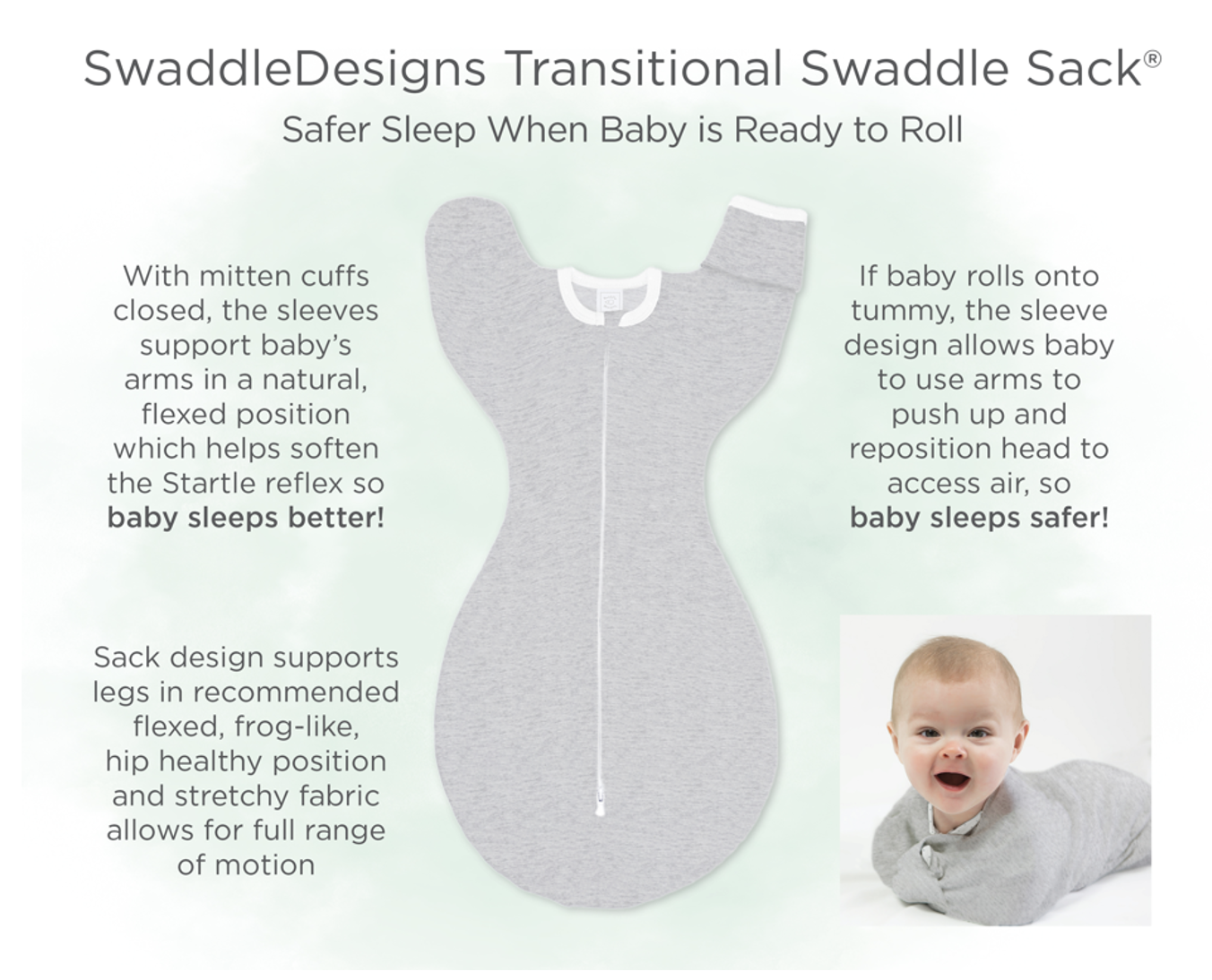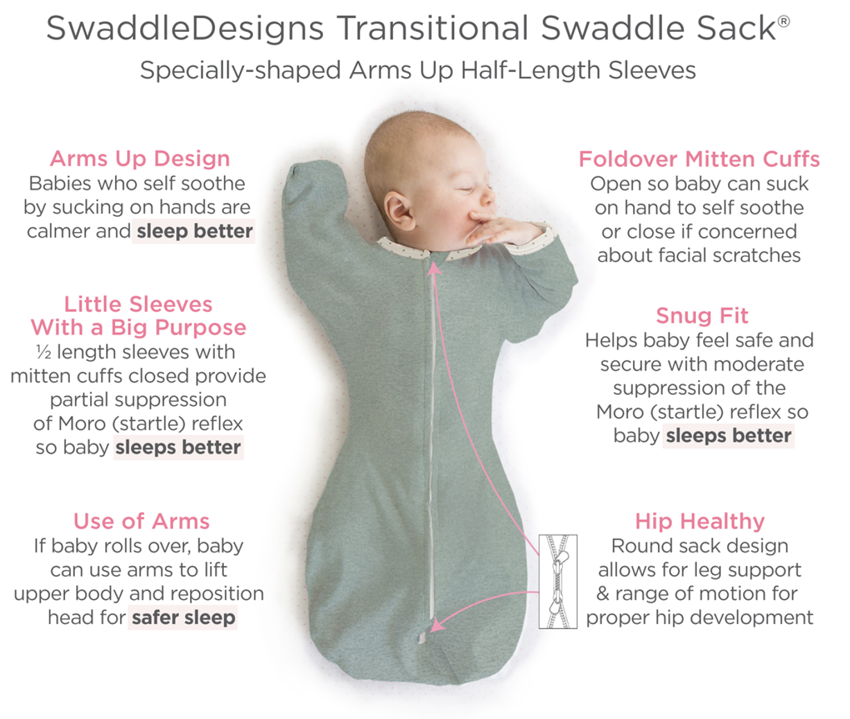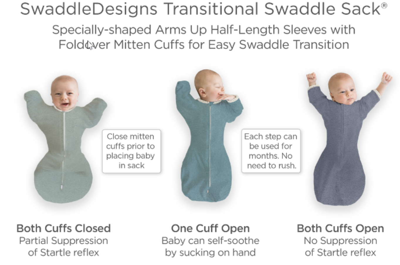 - During the Transition Stage, the SwaddleDesigns Transitional Swaddle Sack® helps babies sleep better and safer, because of the patented arms up half-length sleeves with foldover mitten cuffs closed provides partial suppression of Moro reflex, and simultaneously, the design provides arm mobility, allowing baby to use their arms to self-reposition if baby rolls over.