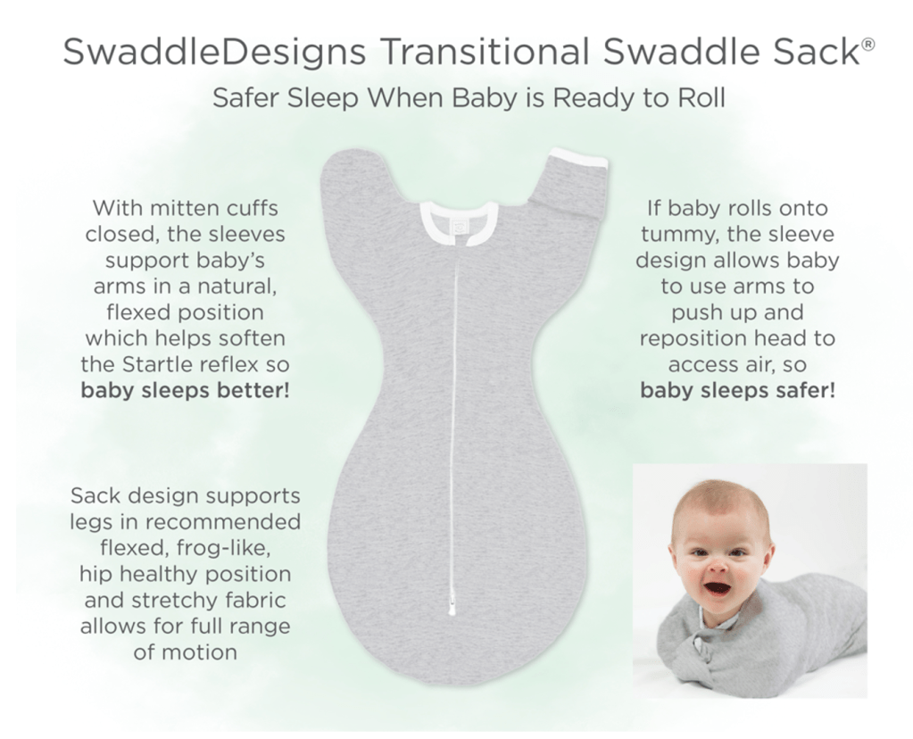 The SwaddleDesigns Transitional Swaddle Sack is unique and thoughtfully designed for this very challenging time when baby is transitioning from a swaddle, but is not ready to sleep well in a sleeveless wearable blanket because it simultaneously provides partial suppression of the Moro reflex and enough arm mobility if baby were to roll over onto tummy.